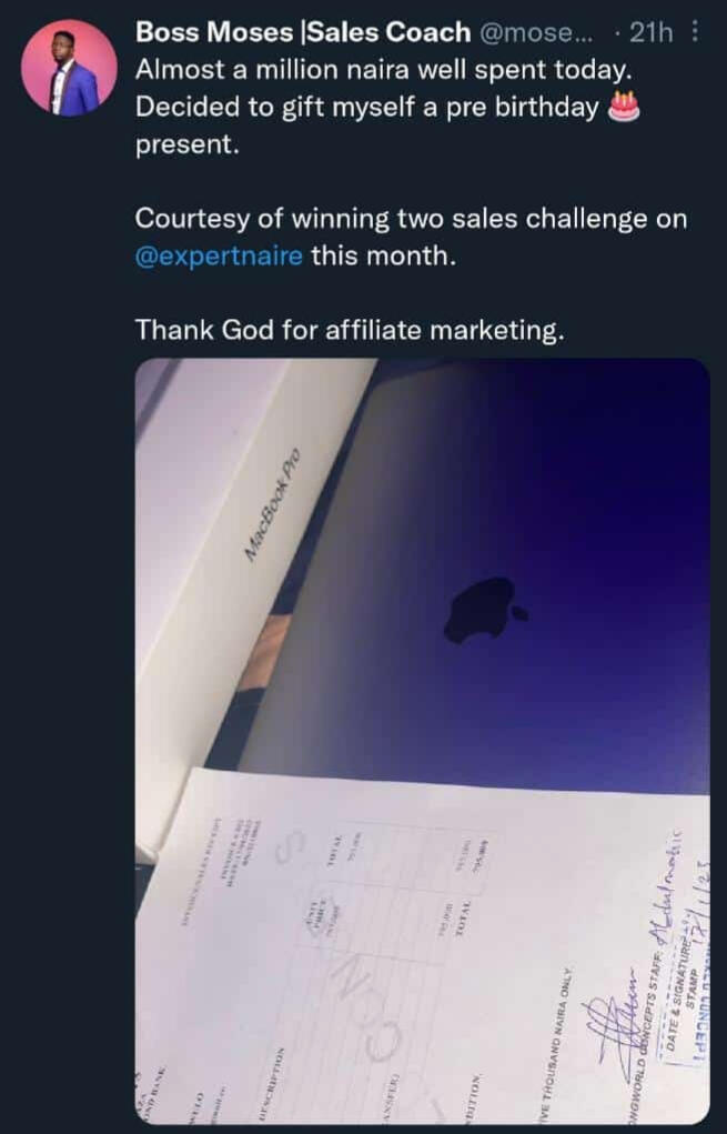 I was at rock bottom and was alone.But my story change when;I discovered affiliate marketing in May/22 and I decided to go into it.I started by signing up for affiliate marketing training program and i register to become an affiliate marketer. Two months after I made my first sale and was paid ₦56,500 in commission.Also i was able to buy myself a new Samsung phone after 4months that i joined affiliate marketing business and ever since then it has always been better, getting paid weekly.